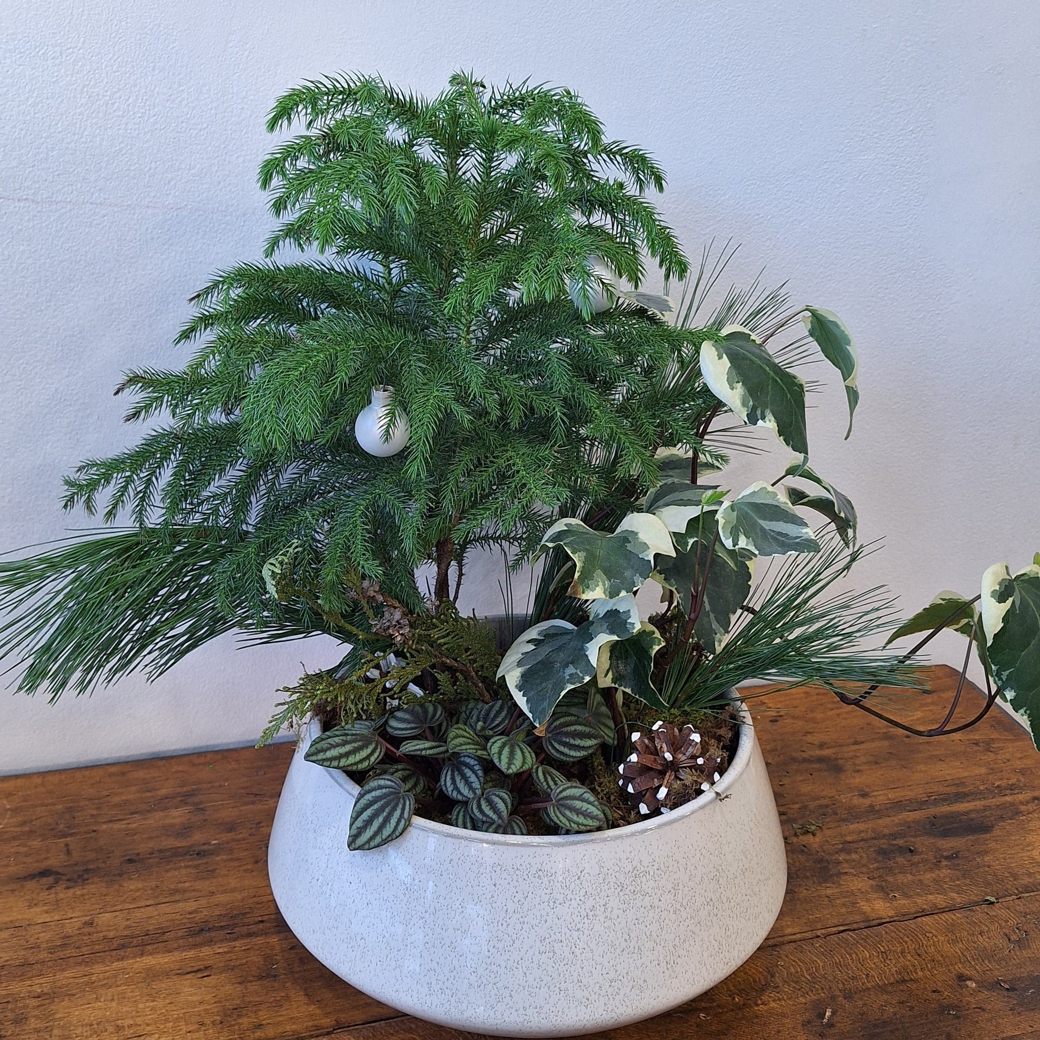 This arrangement is made in a white ceramic bowl. Plants will vary, but we will do our best to accommodate your preferences. We will only combine plants that tolerate similar care conditions.