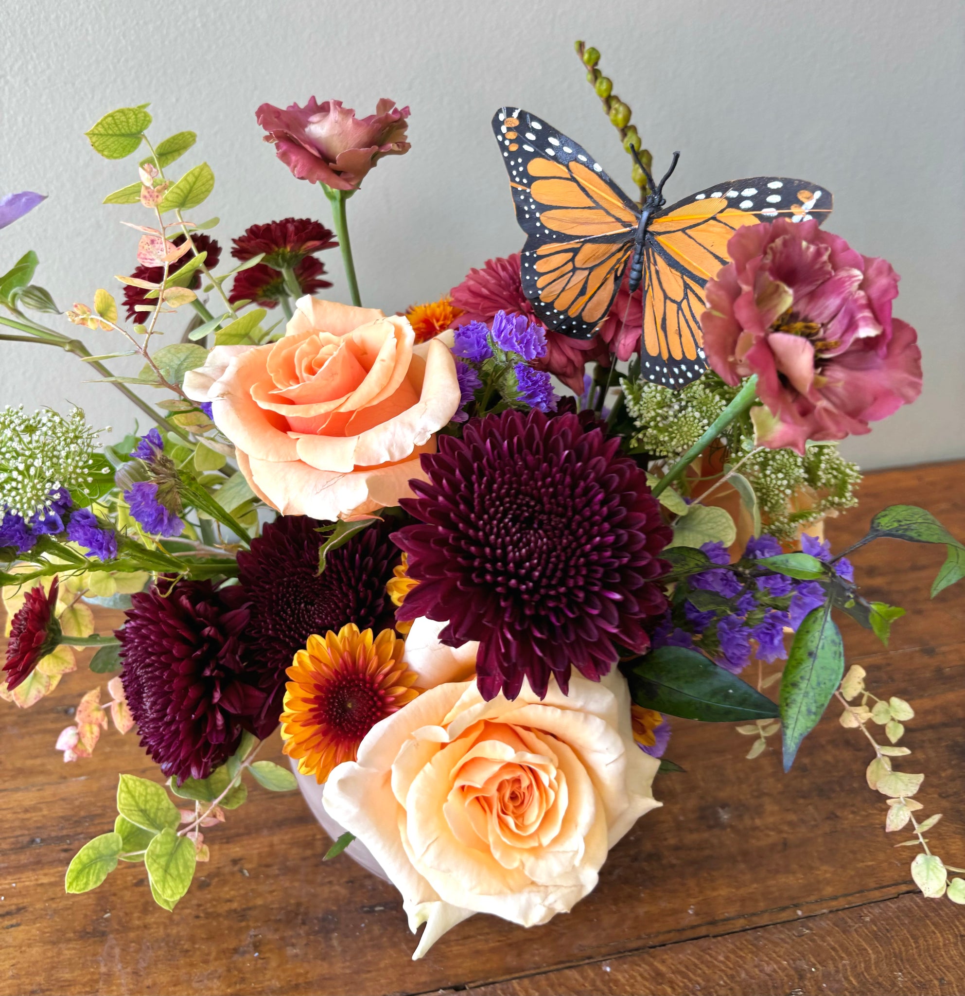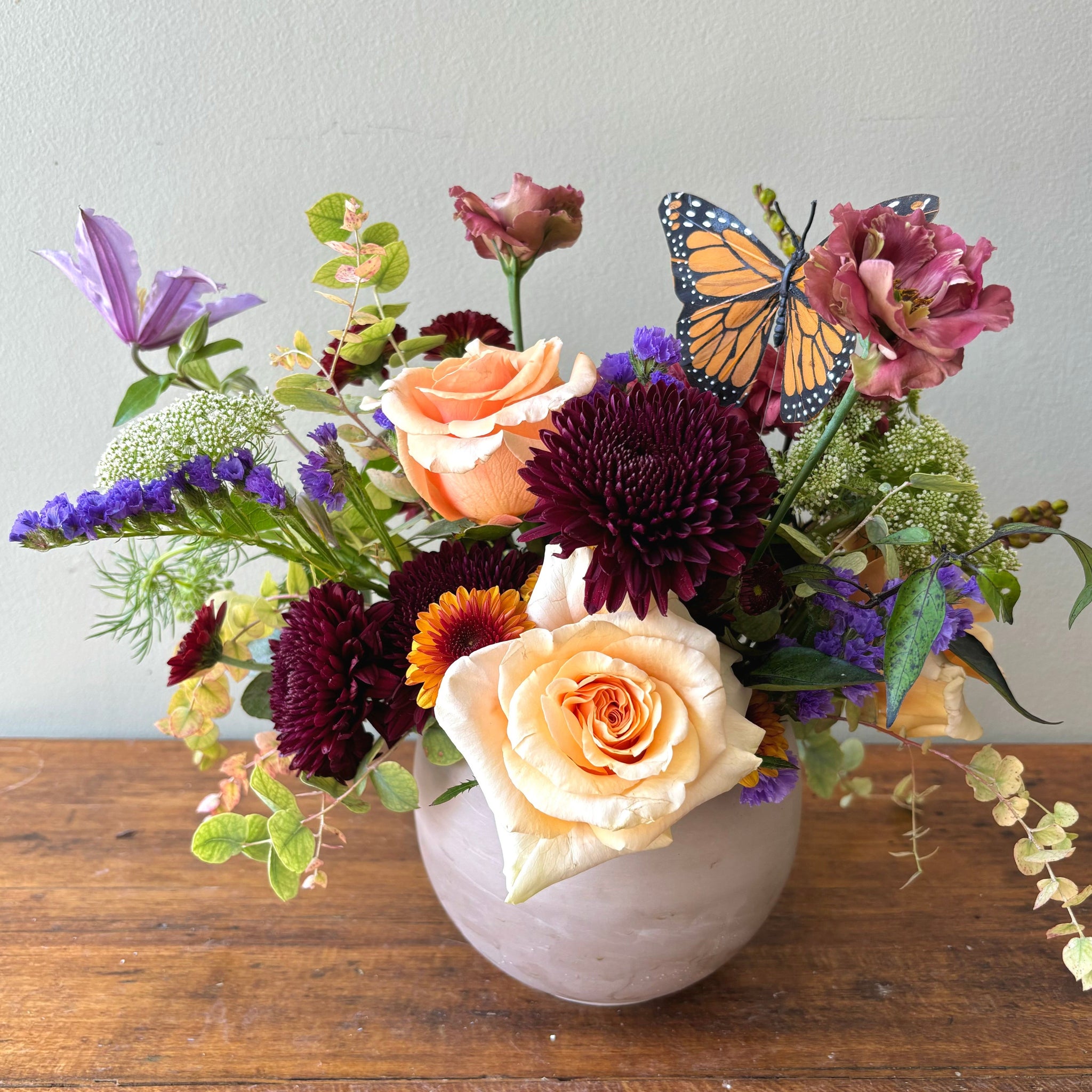 Isobel brings beauty and joy in this stunning flower arrangement and its delicate butterfly. As Isobel fluttered into our lives, she has captured our hearts and inspired us with her charm. Add a touch of nature and elegance to any space with Isobel.