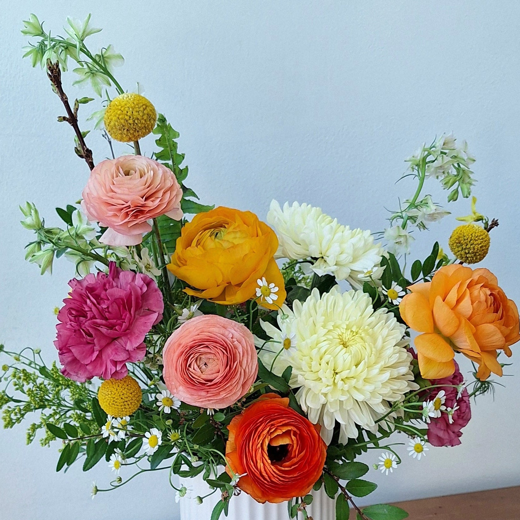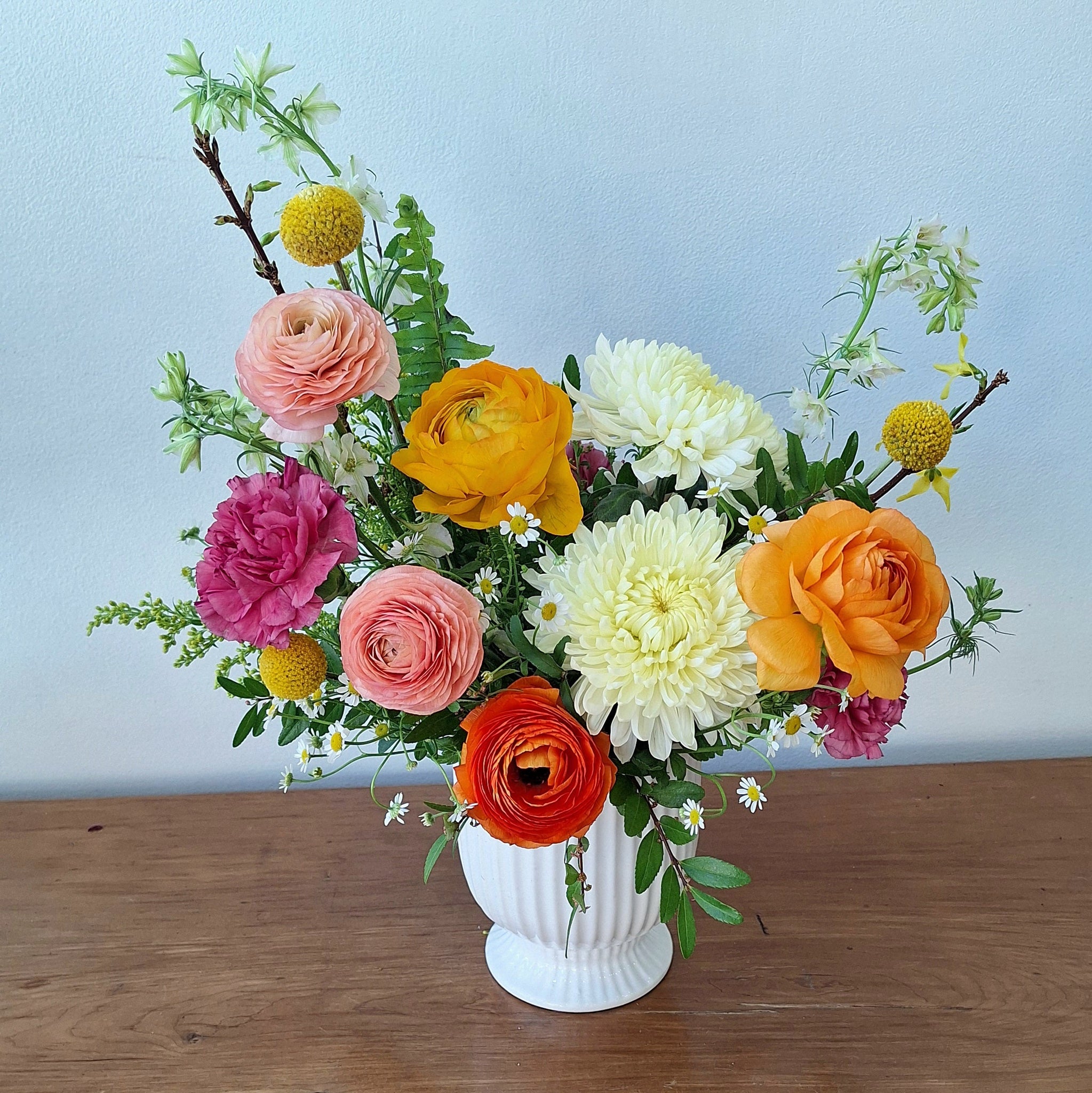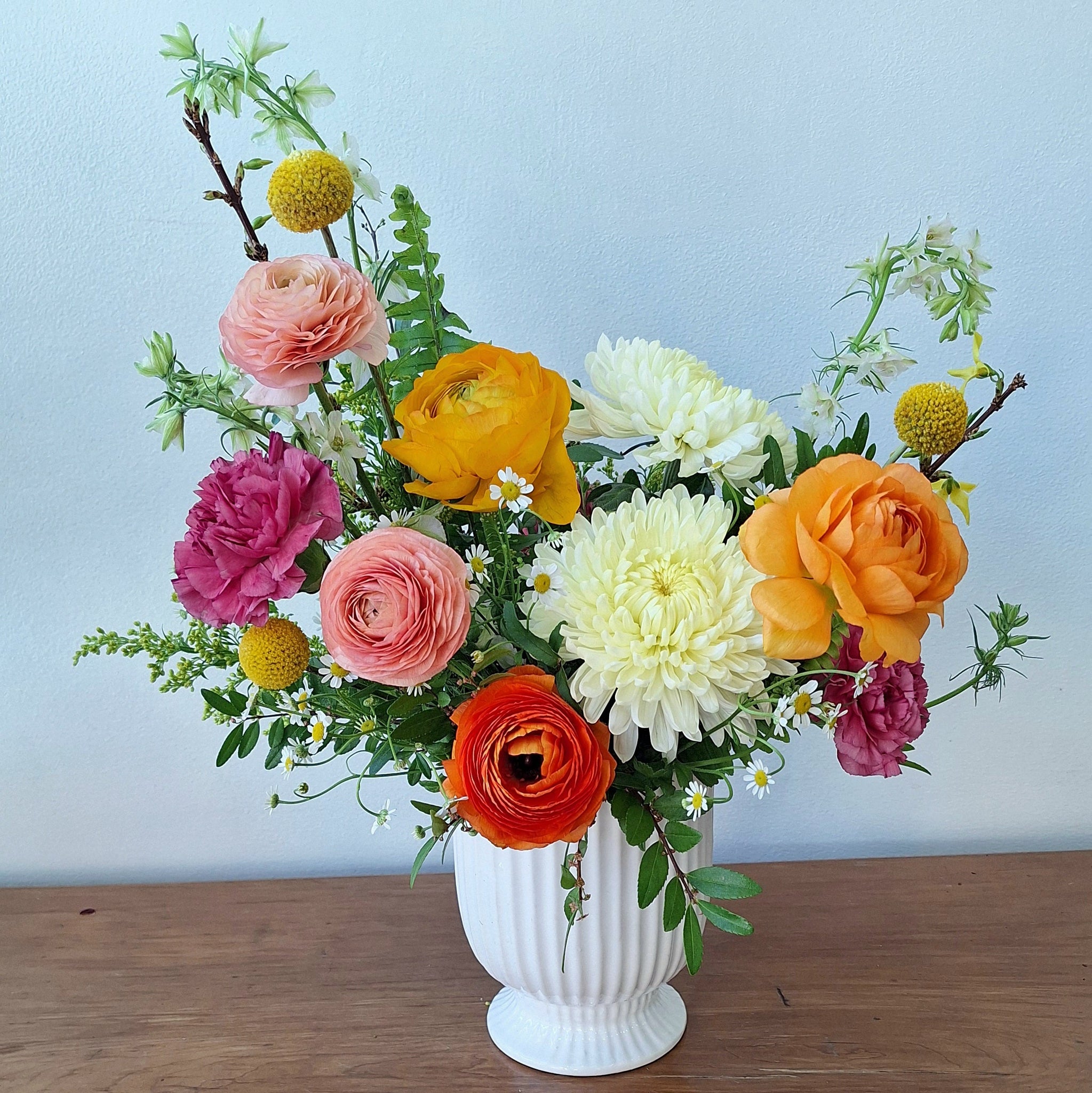 This arrangement includes ranunculus, chrysanthemums and a mix of other blooms in an elegant white ceramic container.