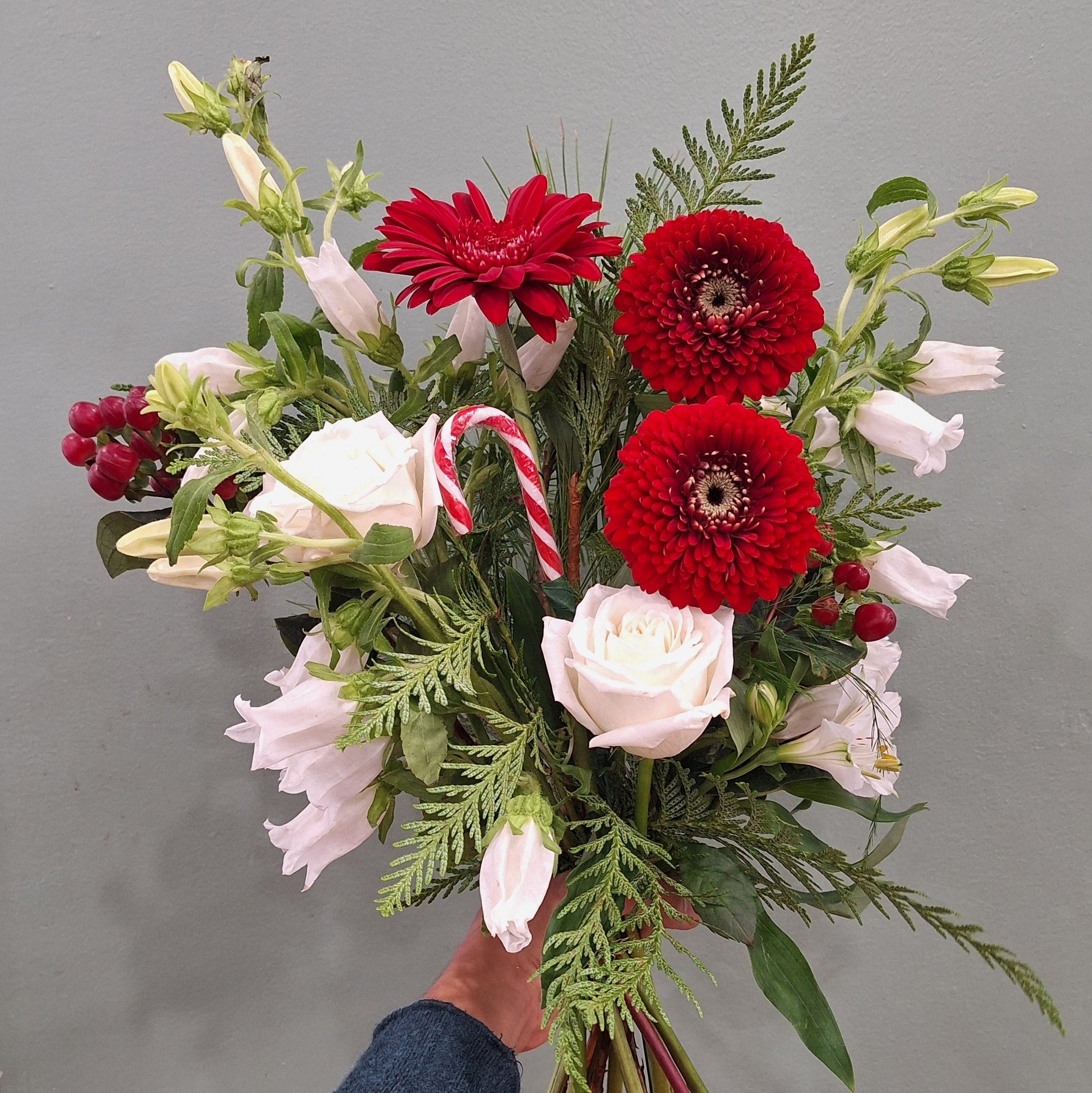 Indulge in the sweet magic of the season with our Candy Cane Christmas Bouquet. This exquisite bouquet features a real candy cane, adding a touch of whimsy to the traditional holiday flowers. Perfect for gifting or decorating your own home with a festive and playful touch. Bring joy to your holiday celebrations with this charming bouquet.