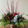 This arrangement is made with magnolia, ilex berries, eucalyptus, pinecones, dogwood and Christmas greens.