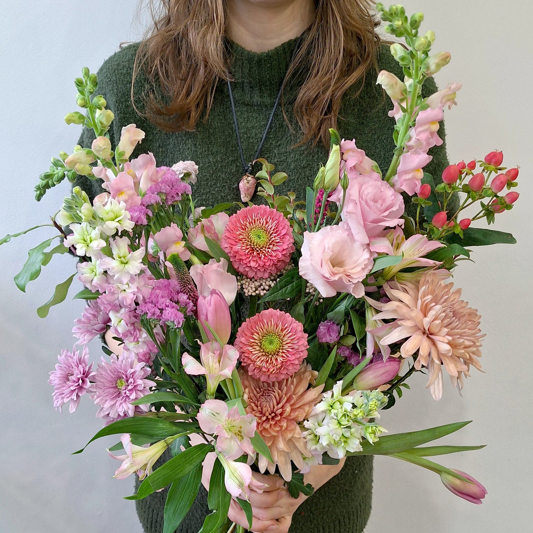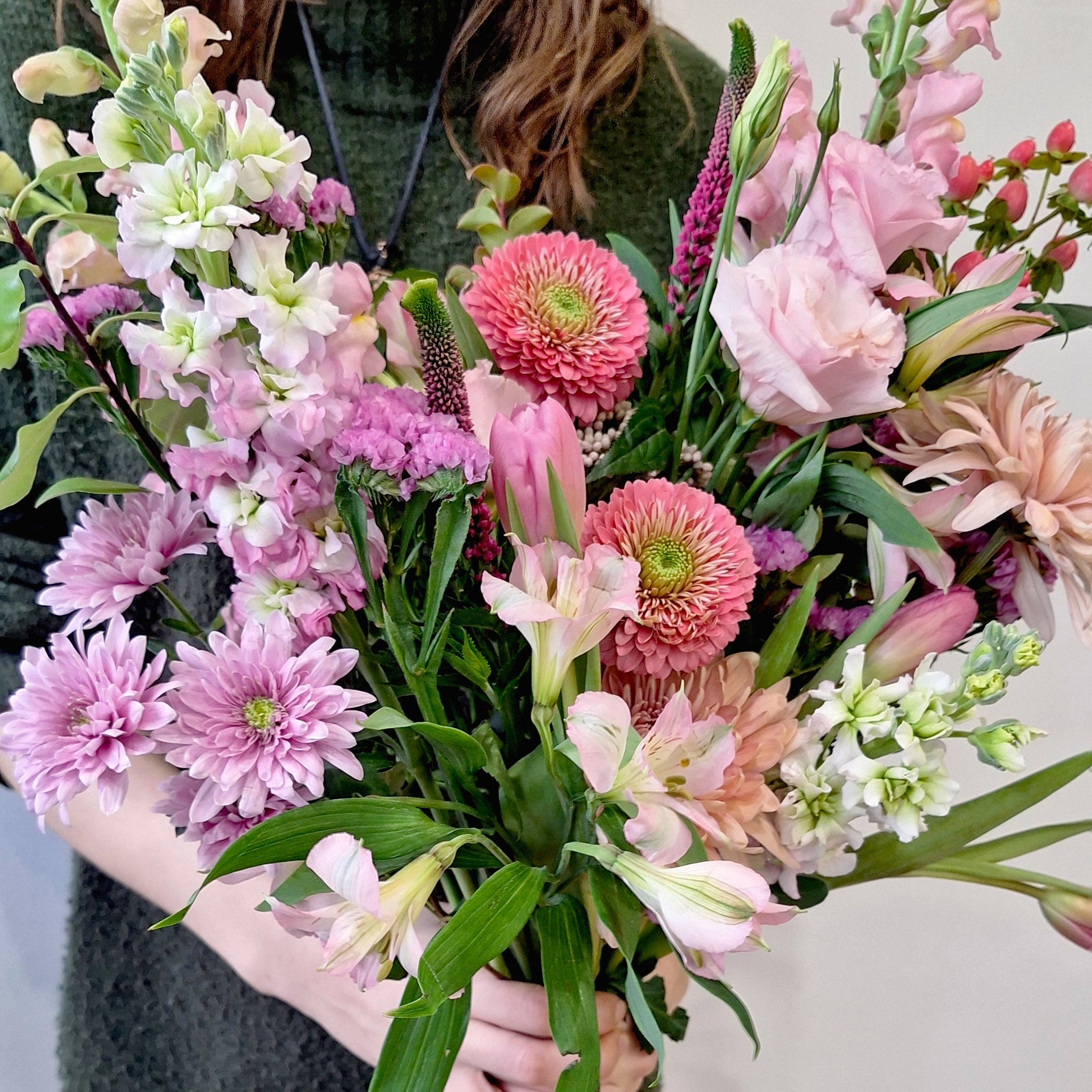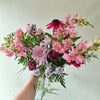 A pink bouquet of fresh flowers. Our designer's will select a bouquet to light up any room. This bouquet is delivered without a vase .